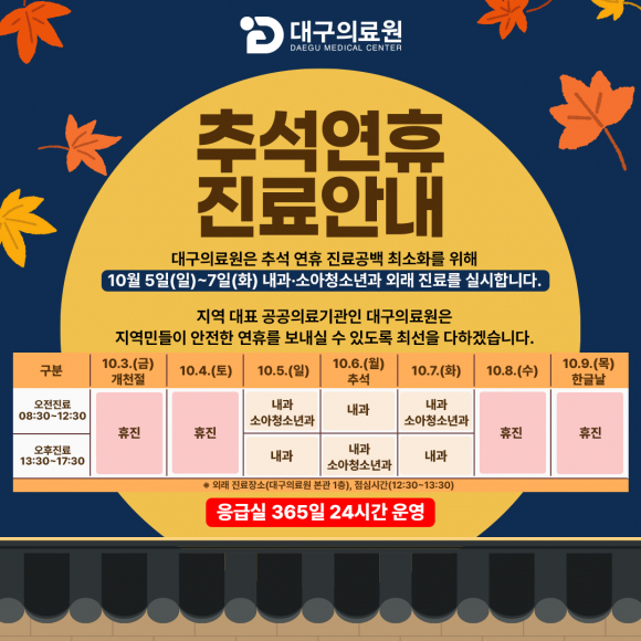 대구의료원, 추석 연휴 5일~7일 3일간 내과. 소아청소년과 외래진료 운영