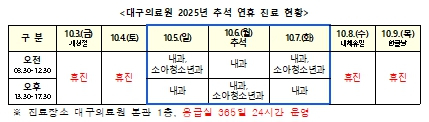|  | | | ↑↑ 대구의료원 2025 추석 연휴 진료 현황 | | ⓒ CBN뉴스 - 대구 | | [cbn뉴스=이재영 기자] 대구의료원(의료원장 김시오)이 추석 연휴 기간(10.3.~9.) 응급실 운영을 강화하고, 오는 5일(일)~7일(화)은 내과·소아청소년과 외래 진료를 실시한다.