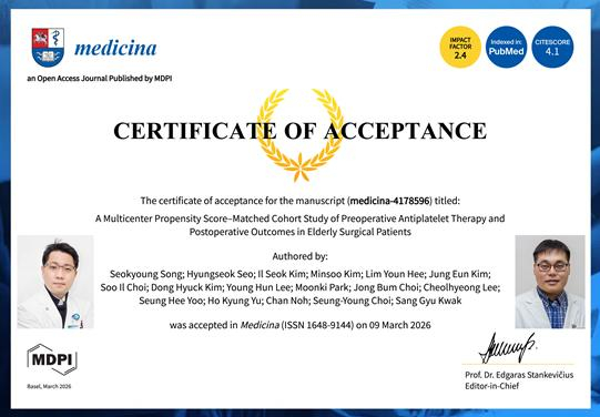 이번 연구는 ‘노인 수술 환자의 수술 전 항혈소판제 사용과 수술 후 임상 결과의 연관성(A Multicenter Propensity Score–Matched Cohort Study of Preoperative Antiplatelet Therapy and Postoperative Outcomes in Elderly Surgical Patients)’을 주제로 진행됐다. 연구진은 실제 임상 데이터를 기반으로 성향점수 매칭(propensity score matching) 분석을 적용해 교란 요인을 보정하고, 수술 전 항혈소판제 사용이 수술 후 임상 결과에 미치는 영향을 분석했다.
